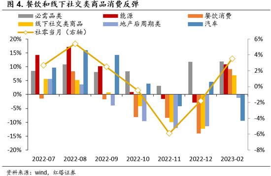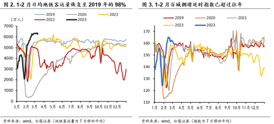一是出行、社交、聚会相关的消费增多。防疫优化后,居民生活社交半径扩大(地铁客运量和百城拥堵指数明显恢复),线下出行和消费明显增多,再加上节日聚会的带动,此前积压的消费需求在1-2月集中释放。