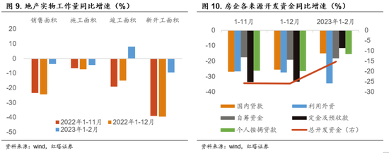 1-2月商品房销售面积同比下跌3.6%,商品房销售额同比下跌0.1%。施工面积、竣工面积、新开工面积同比增速分别为-4.4%、8.0%和-9.4%。房地产开发投资完成额同比下降5.7%。