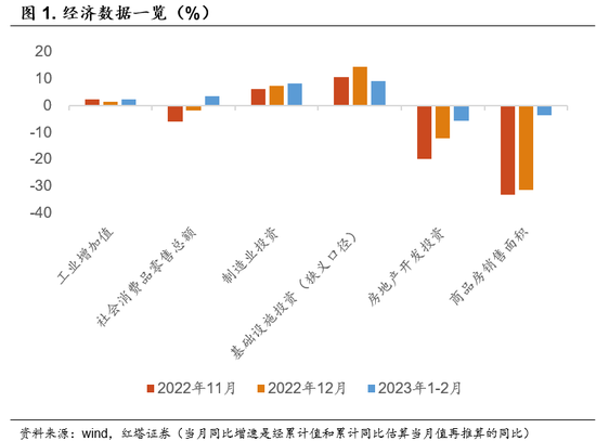 1-2月,规模以上工业增加值同比增长2.4%,比2022年12月份加快1.1个百分点,两年平均增长4.9%。社会消费品零售总额同比增长3.5%,2022年12月份为下降1.8%,两年平均增长5.1%。固定资产投资同比增长5.5%,比2022年全年加快0.4个百分点,两年平均增长8.8%。分领域看,基础设施投资同比增长9.0%,制造业投资增长8.1%,房地产开发投资下降5.7%。
